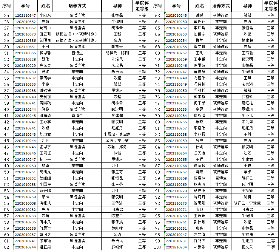本公示中的评定等级为博士奖助学金中的学校学业助学金等级,学业奖学金及国家助学金部分不分等级,根据学校发布的参评条件及资助对象要求,符合相关条件的同学均获评。