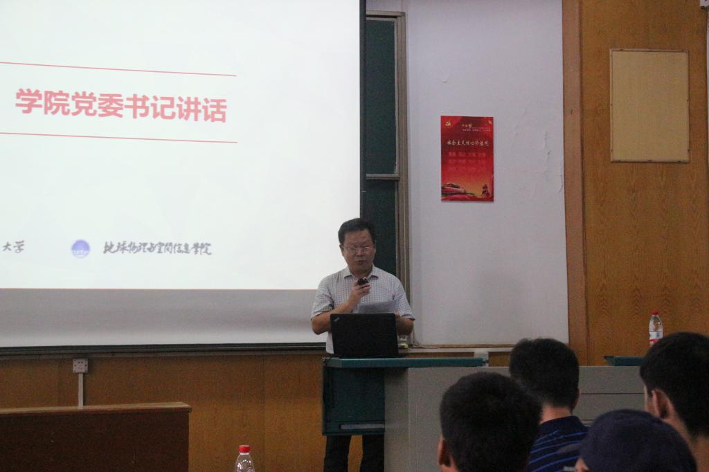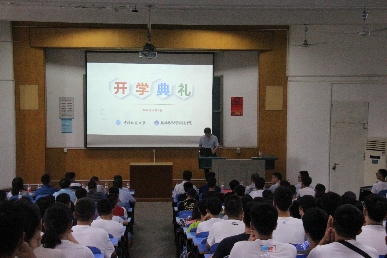 胡祥云院长致欢迎词。胡院长首先表达了对新生们的热烈欢迎,欢迎他们加入地空,成为一个物探人。他以风趣的语言、具体的实例,向新生们传授大学生活的经验。胡院长还提醒同学们,进入大学并不意味着放松,而是一段新征程的开始,希望同学们规划好大学生活,时刻秉承“艰苦朴素,求真务实”的校训,做一个目标明确、志存高远的优秀大学生。