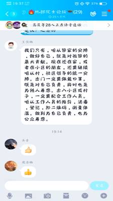 研究生同学也就这次思政大课积极发表自己的学习感悟,19级硕士生王佳楠同学在线上分享自己的课程体会,“我们只有听从国家的安排,做好自己,就是最国家最大的贡献,在家一定要配合社区工作人员的工作,对自己、也为他人负责”。
