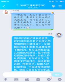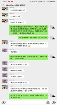 19级王珺璟同学评价此次思政的大课“内容充实、鞭辟入里、饱含理性与深情,感触颇深,受益匪浅”,“本次疫情防控充分体现了我国强烈的国际责任感,武汉封城为全球战“疫”做出了巨大贡献。授课的老师仔细解读了中国特色社会主义制度是完全可以转化成治理效能的,正因此,我们能集中力量办大事,万众一心,共克时艰。挑战虽然严峻,但只要我们坚定信心、团结在党的全面领导下,定能早日取得胜利!”