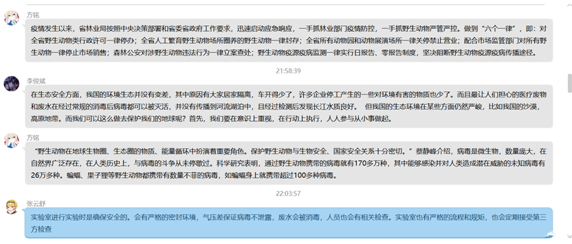 2019级06D191班王忠义同学认为,“在生物安全防控方面上,我们要加强对野生动物的知识普及,有关部门应该加大对野生动物的保护,对野味贩卖市场的监管;从公共卫生安全角度来说,此次的疫情应该给我国敲响警钟,加强完善紧急卫生事件的防控,以此次疫情为经验,整理出一套完整的应对方案。希望此次全球疫情能尽早控制,让世界人民有一个健康、安全的家”。