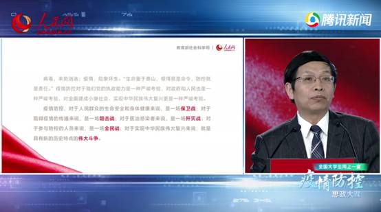 秦宣教授说:疫情防控不仅是一场保卫战、一场阻击战、一场歼灭战,更是一场全民战,对于实现中华民族伟大复兴来说,更是新的历史特点的伟大斗争,艾四林教授教授也说了这场战役是灾难也是机遇,在这场全民战役中政府及时有效的进行疫情防控,人民积极配合政府政策,工作人员认真负责一直站在疫情的第一线,疫情对于中华民族伟大复兴是一场严峻的考验,在这场考验中我们向全世界展现了中华民族的团结一致、中国政府强大的执行力、中国制度的优越性。中华民族数千年的文明史上,人民和瘟疫的战争从来没有停止,但中华民族从来没有被打倒。在本次的疫情告诫我们必须坚持人与自然和谐共生,必须尊重自然保护自然。
