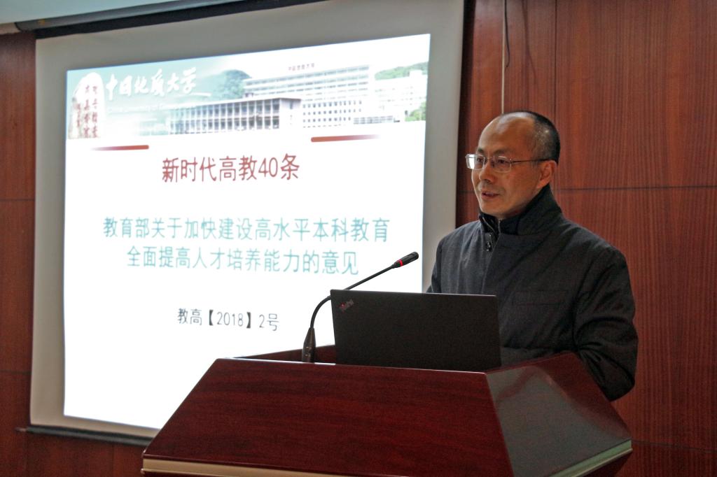 刘勇胜副校长总结发言,他要求地空全体教师明确教师的责任和担当,认真学习领悟本科教育教学思想,学习学校的相关政策和熟悉学校的教学资源,结合学院实际,以问题为导向,把“严在地大”落到实处,推进学院各项事业的快速发展。