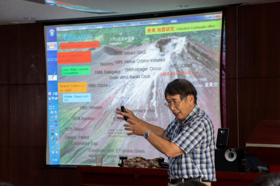 Koichiro Oyama授和师生分享了他过去40余年执行火箭和卫星任务的经验。他谈到,恶劣的太空环境对科学仪器性能的要求极为严苛,成功的太空任务始于地面试验室内太空等离子体环境的模拟和建立,需在模拟环境中对仪器进行千百次的测试,修正和改造。他还点出了未来重要且可行的地球行星科学研究方向,如地震等岩石圈现象和太空环境的耦合,以及金星大气超速旋转。