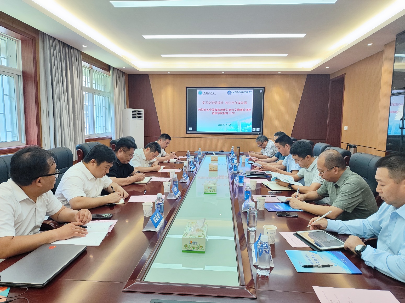 为推动学习贯彻习近平新时代中国特色社会主义思想主题教育走深走实,进一步强化校企创新合作,6月26日,中国煤炭地质总局水文物测队副队长龚惠民带队,到beat365唯一官方网站开展主题教育调研交流。