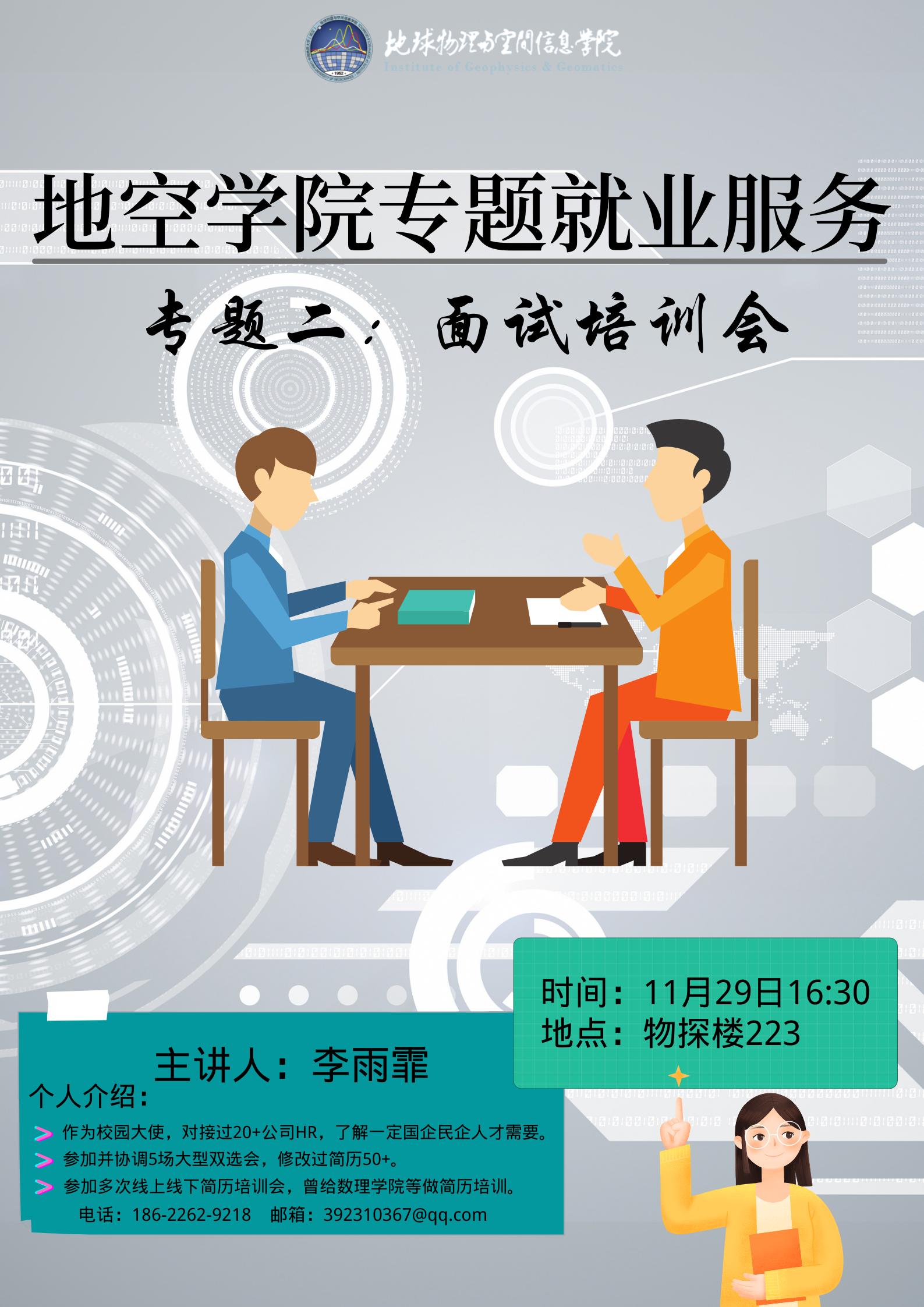 20211129日下午16:00,beat365唯一官方网站专题面试技巧就业服务第于物探楼223顺利进行。本次就业服务邀请到了就业办讲师团的李雨霏同学,李雨霏同学对接过多个公司HR,对各企业人才需求有一定了解,多次参加各学院就业服务工作,经验丰富,能力突出。
