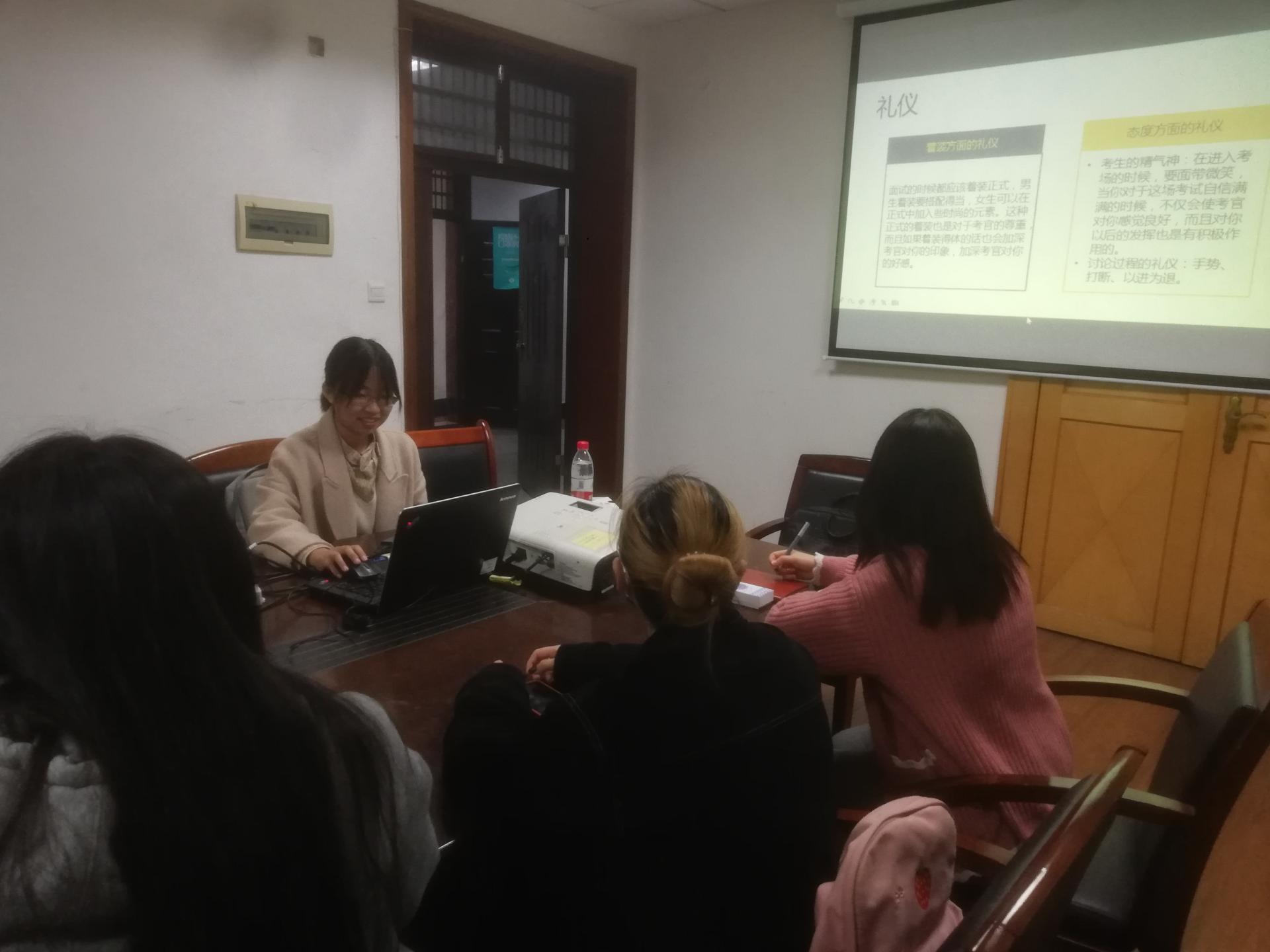 李雨霏同学就面试中重点的无领导小组讨论环节进行了介绍与讲解,无领导小组面试是一种采用情景模拟的方式对考生进行集体面试的面试考察方式,考官可以通过考生在给定情景下的应对危机、处理紧急事件以及与他人合作的状况来判断该考生是否符合岗位需要。李雨霏同学通过无领导小组讨论中的角色分配、注意事项、讨论要点、题型分类等多个方面进行了剖析说明,深入浅出、简明易懂,让来参加的同学收获颇多。